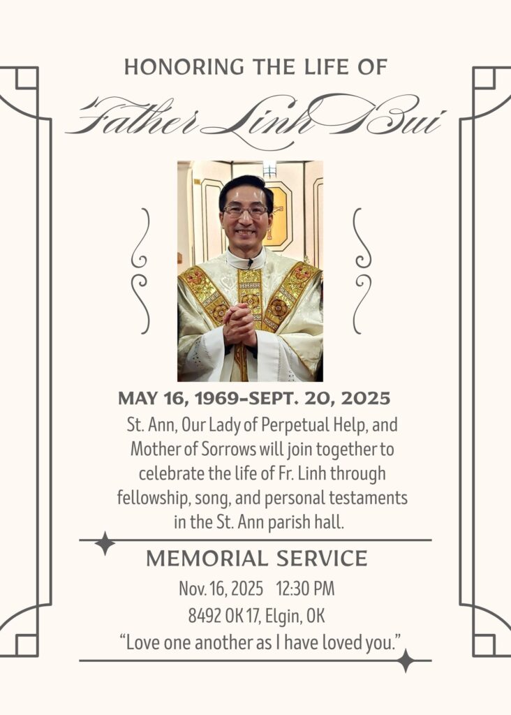We are creating a memorial photo book to honor the life and legacy of Father Linh. If you have any photos of Father Linh, whether from church events, special moments, or casual gatherings, please share them with us. You can send photos no later than October 25th to: Quinlan.jennifer23@gmail.com or 719-464-8722