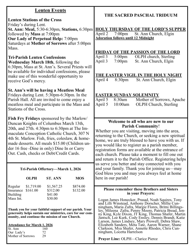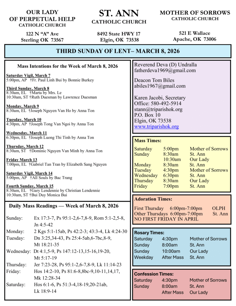 Menu 580-492-5914 stann@triparishok.org 8492 OK-17, Elgin, OK 73538 Facebook Home Bulletin About Us About News / Events Contact Us Home Bulletin About Us About News / Events Contact Us Home Bulletin About Events Contact Us Home Bulletin About Events Contact Us September 14, 2025 (new)September 7, 2025August 31, 2025 If you have a prayer intention, would like to arrange a time/day for confession or have any other questions please contact us below! Contact Us 8492 OK17, Elgin, OK 73538P.O. Box 10Phone: 580-429-5914 Office Hours:Monday-Thursday: 7:30 AM – 3:00 PM